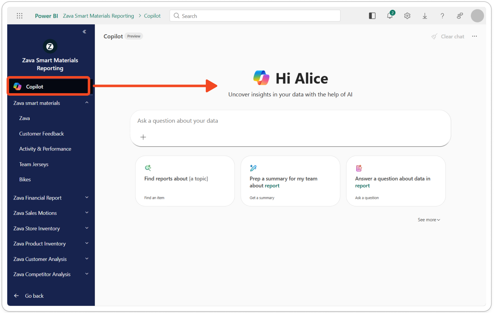 レポートスコープの Copilot は、Power BI サービスでワークスペース アプリまたは組織アプリを開いたときに、アプリのナビゲーション内に表示されます。