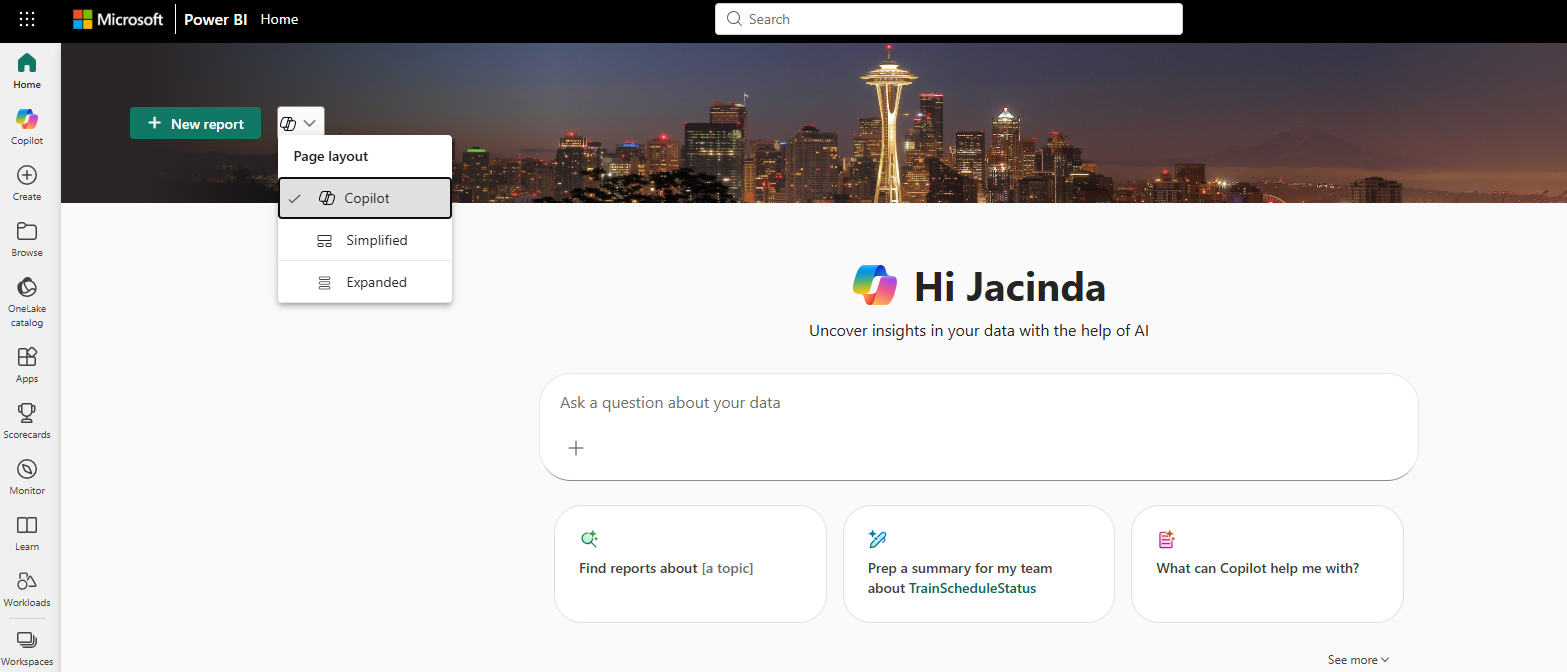また、テナント管理者によってスタンドアロン Copilot が有効になっており、Fabric Copilot容量(FCC容量)が使用可能な場合は、Power BI のホーム画面上にもスタンドアロン Copilot が表示されます。