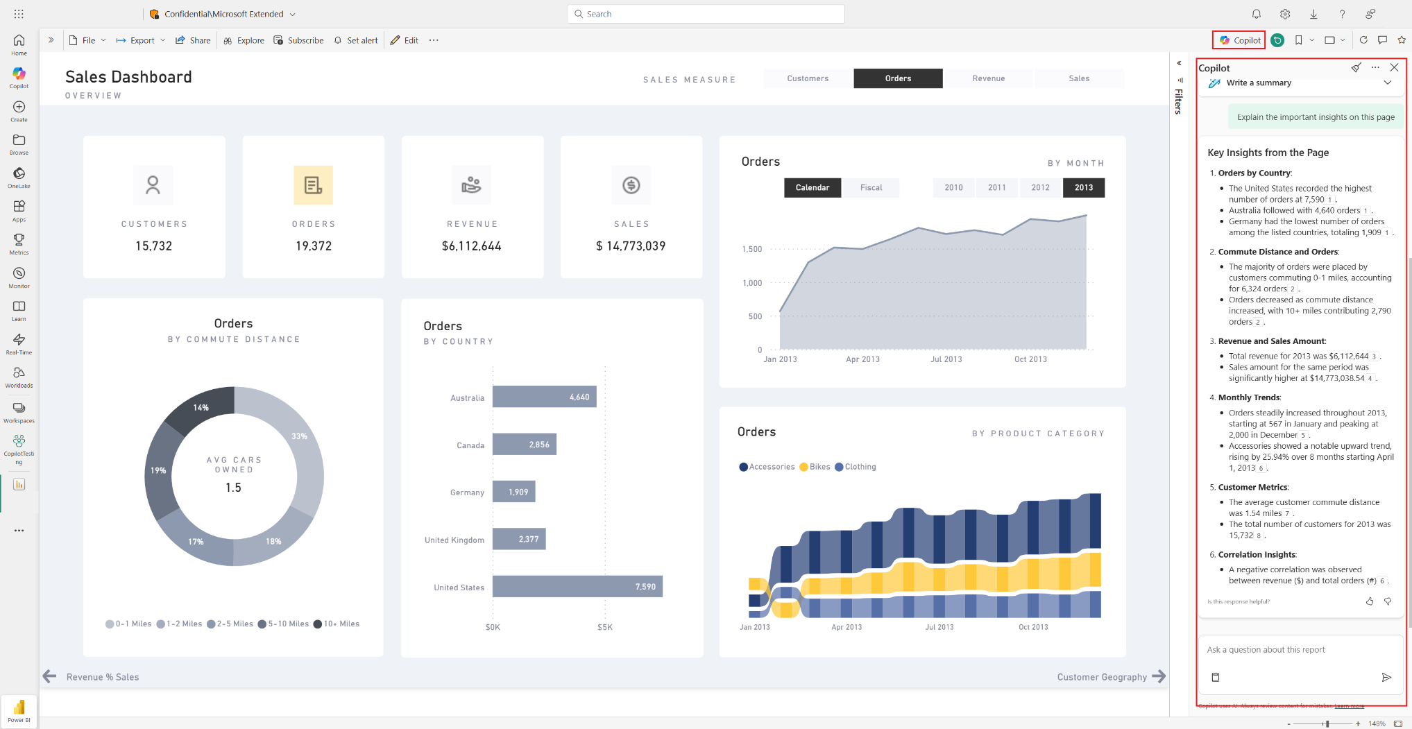 レポートとセマンティックモデルのための Copilot では、開いているレポート内のデータに関して質問をしたり、新しいレポートの作成を行ったりすることができます。