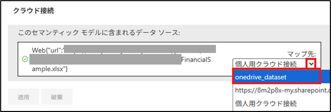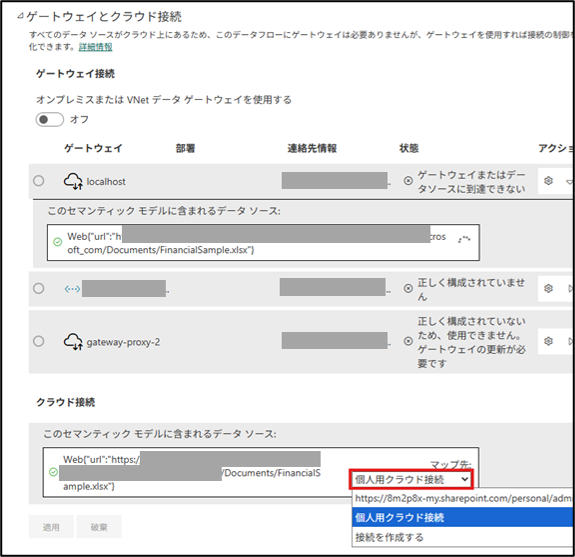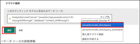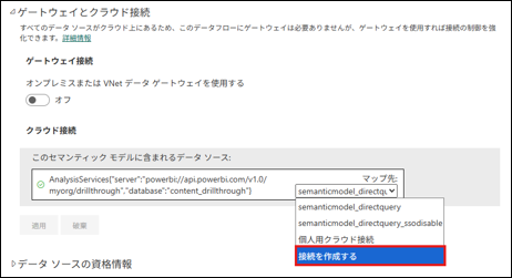 作成後に、セマンティックモデルの設定ページに戻り、クラウド接続のマップ先で、「個人用クラウド接続」から先ほど作成した接続を選択するように変更して、適用してください。