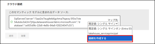 作成後に、セマンティックモデルの設定ページに戻り、クラウド接続のマップ先で、「既定値: シングル サインオン(Entra ID)」から先ほど作成した接続を選択するように変更して、適用してください。