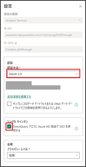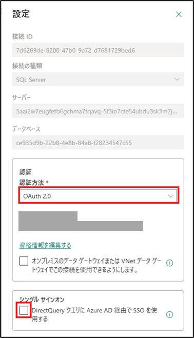 また、下方にあるシングルサインオンのオプション [DirectQuery クエリに Azure AD 経由で SSO を使用する] が無効であることを確認します。