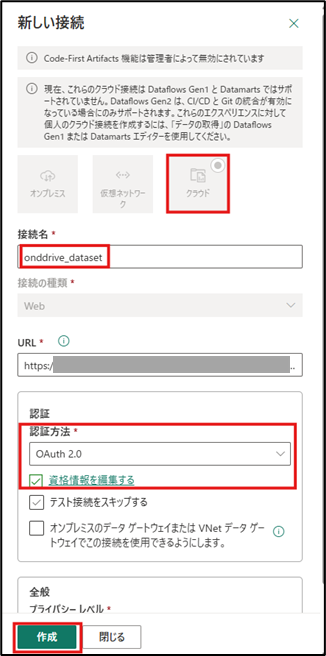 クラウド接続であることを確認し、任意の接続の名前を入力して、資格情報を設定すれば、「共有可能なクラウド接続」を作成できます。