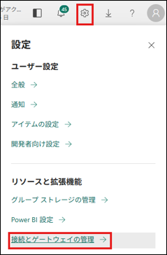 作成した「共有可能なクラウド接続」を他のユーザーと共有するには、画面右上の歯車ボタンの [設定] > [接続とゲートウェイの管理] を開きます。