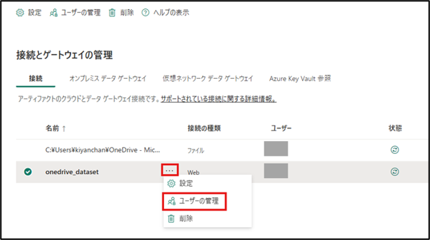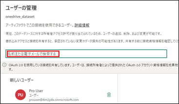 作成した接続に対して[…] > [ユーザーの管理] を開き、他に共有したいユーザーのメールアドレスや名前で検索し、該当ユーザーと共有できます。
