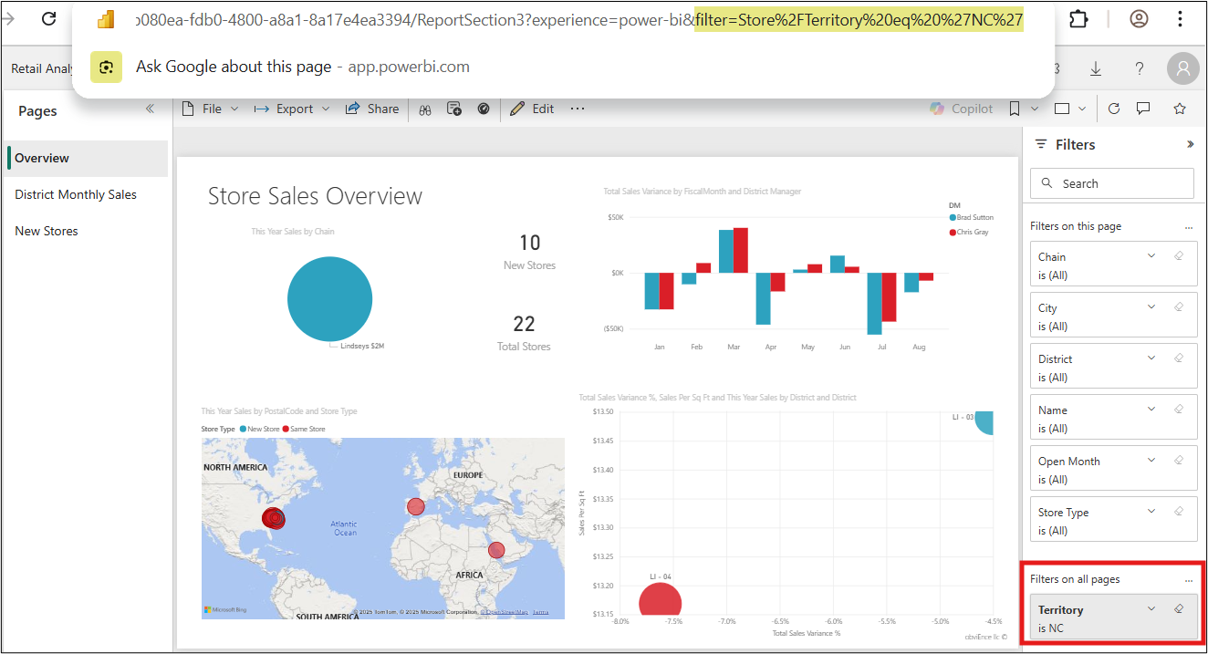 Power BI サービスでレポートを開くと、各ページには固有の URL が割り当てられています。その URL にクエリ文字列パラメーターを追加することで、レポートを開いたときに自動的にでフィルターを適用できます。